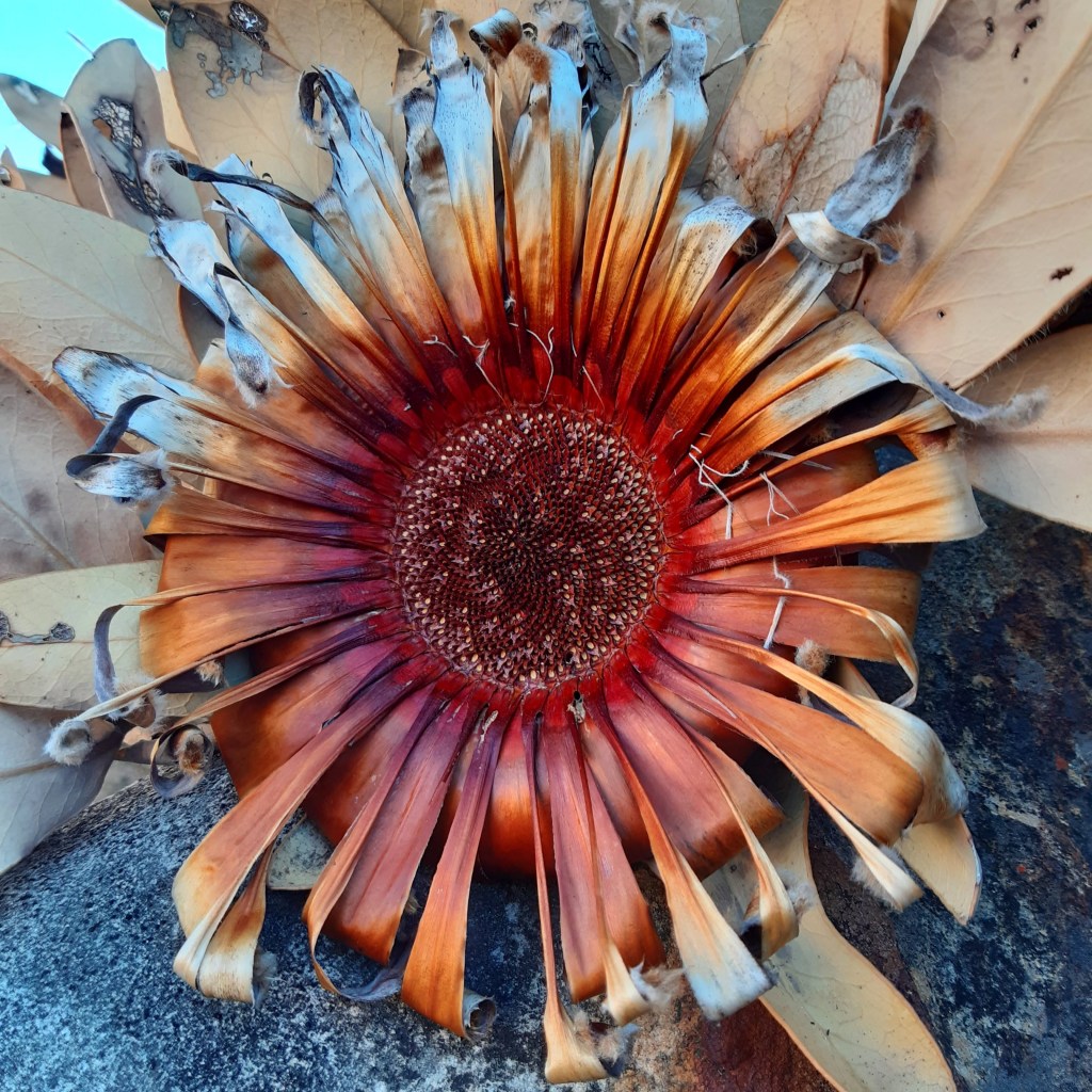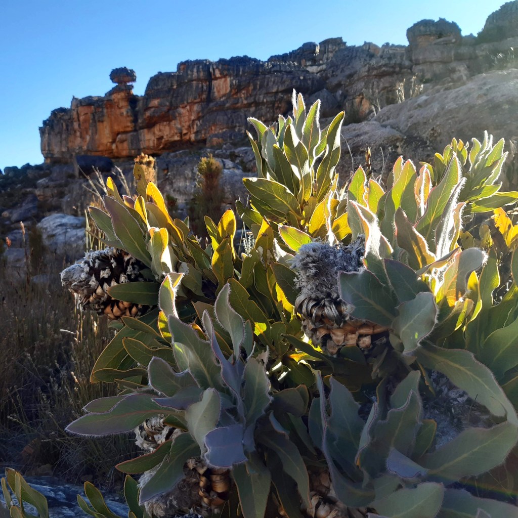 I studied and took photos of brass-coloured ex-proteas, clustered below my cave in burnt-out bush skeletons. I photographed the slanted afternoon sunshine, spotlighting bushes through gaps in the rocky outcrops in the ridge above me. Earlier I had seen several white proteas, alive and freshly in bloom, splashed along the slopes of the valley and river basin.